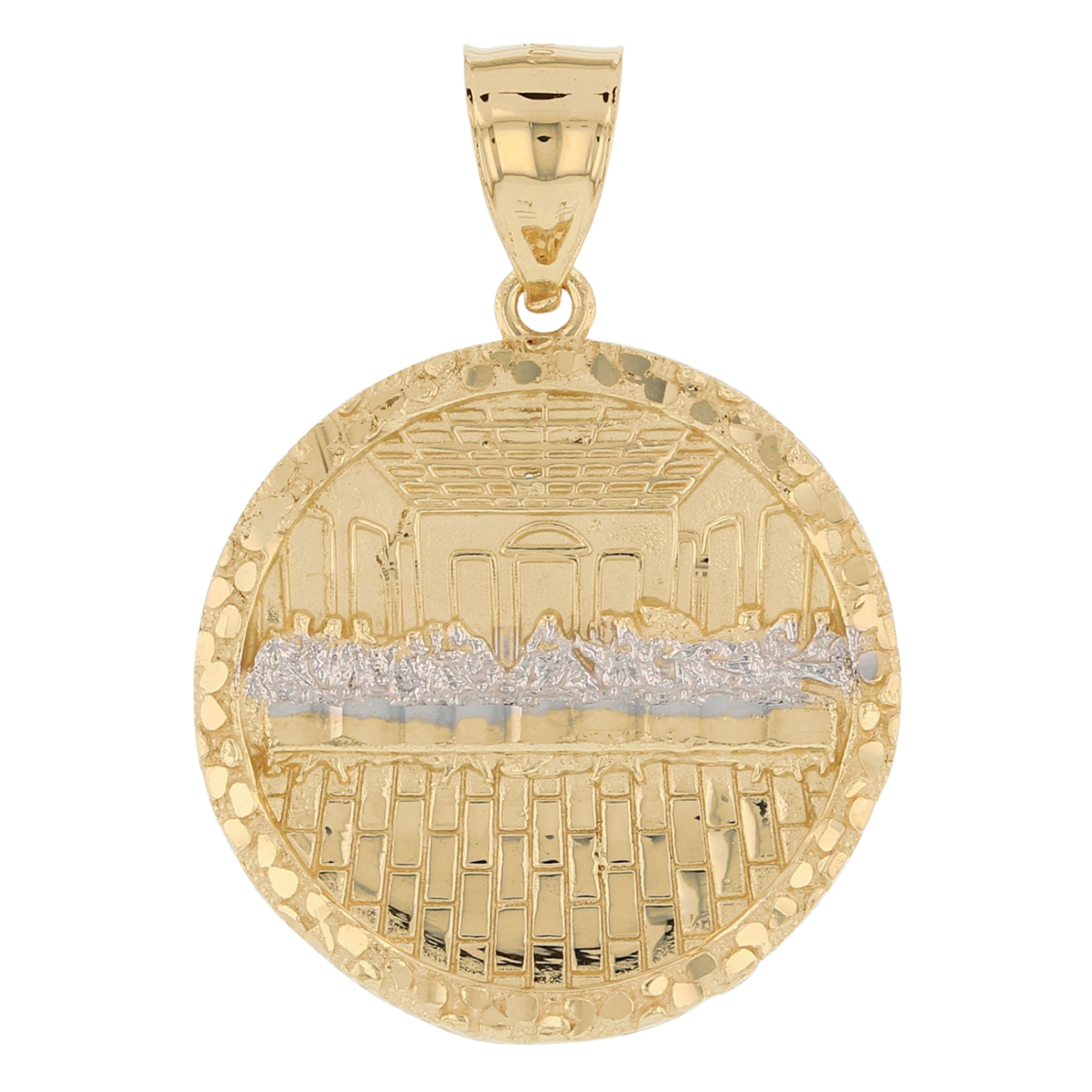 10k Two Tone Gold Small Round Last Supper Mens Diamond Cut Nugget Religious Jesus Pendant (SKU# P13787)